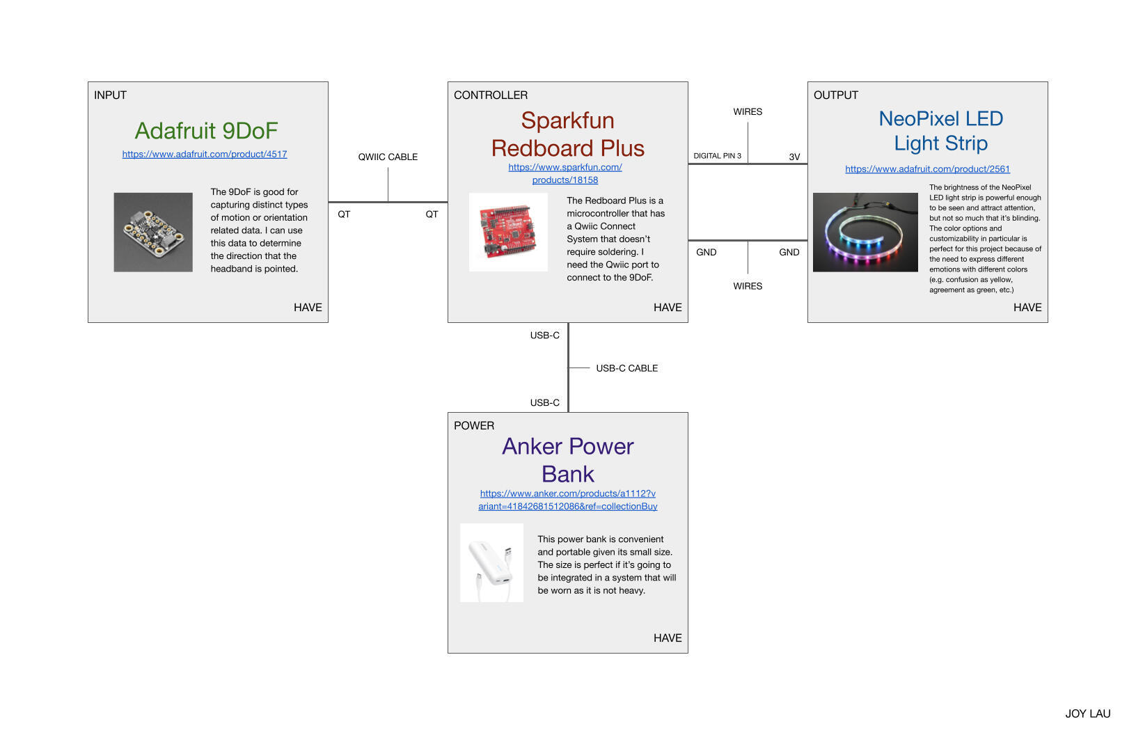Joycelin Lau • Fall 2023 • Expressive WearableIntroducing the "Feedback Horn" – a magical unicorn horn that adds an enchanting touch to communication. This whimsical accessory lights up to provide instant visual feedback during conversations. When you nod in agreement, it glows green, signaling a consensus. A head shake turns it red, indicating disagreement with a burst of color. And when confusion strikes or questions arise, a head tilt sets it aglow in a bright yellow, illuminating the need for clarity. With the Feedback Horn, your expressions become a vibrant language of their own, making interactions both fun and informative.